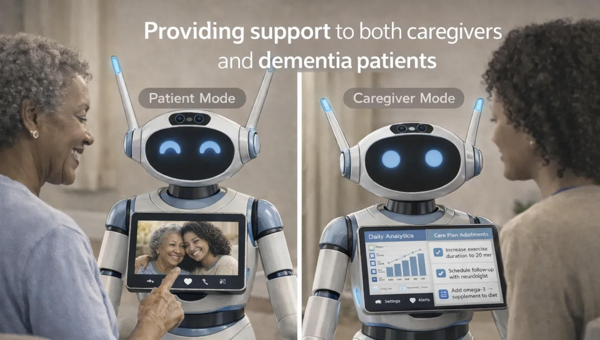 We build mobile robot care partners that work in tandem with caregivers, to provide monitored safety, engagement, and peace of mind when you need it most. Our current focus are families dealing with early and middle stages of Dementia.
